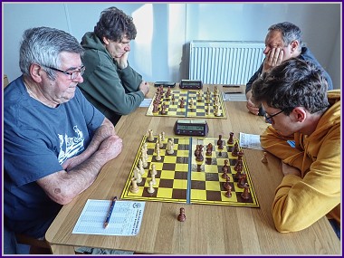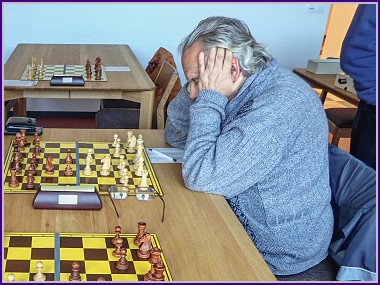 Dohodli jsme se s domácími, že se ujmu role rozhodčího, všechno bylo bezproblémové až na jméno mého soupeře, které jsem při představování hráčů doopravdy nedokázal správně vyslovit. No a pak se hrálo, až malou výjimku na druhém stole (ze strany černého) nebylo slyšet žádné remízové nabídky. A tak tedy jdeme do vedení "zásluhou" Franty, který získal bodík bez boje. 1:0. Jako druhý jsem bodoval já, mladý soupeř se do mě pustil zostra, hlavně na královském křídle se zdálo, že by můj král s oslabeným pěšcovým krytem mohl podlehnout útoku, jenže bílý neměl dostatek trpělivosti ke stupňování převahy a svůj útok v podstatě zakončil ztrátou věže. Sice jsem pak ještě nějakou dobu musel dávat pozor na různé odskoky záludného jezdce, ale podařilo se mi neudělat chybu a po několika výměnách mi ta celá věž zbyla už do jasné koncovky. Soupeř se snažil o protihru do poslední chvíle, ale nástup dvou volných pěšáků skončil matem. Z mé strany, naštěstí. Na malou chvílku zvyšujeme náskok, 2:0. Není to nadlouho. S Pavlem jsme seděli vedle sebe, tradiční vídeňská samozřejmě, ale soupeř se bránil dobře a bylo to spíš vyrovnané. Pavel je pověstný tím, že při hledání útočných možností pěšáky nepočítá, když to vyjde, je z toho obvykle pěkná partie, v opačném případě to končí beznadějnou koncovkou. Dnes k ni ani nedošlo, pozice i bez dvou pěšáků byla hratelná, ovšem přišlo přehlédnutí jednoduché kombinace a před ztrátou minimálně kvality už Pavel kapituloval. Miniaturka, domácí snižují na 2:1.