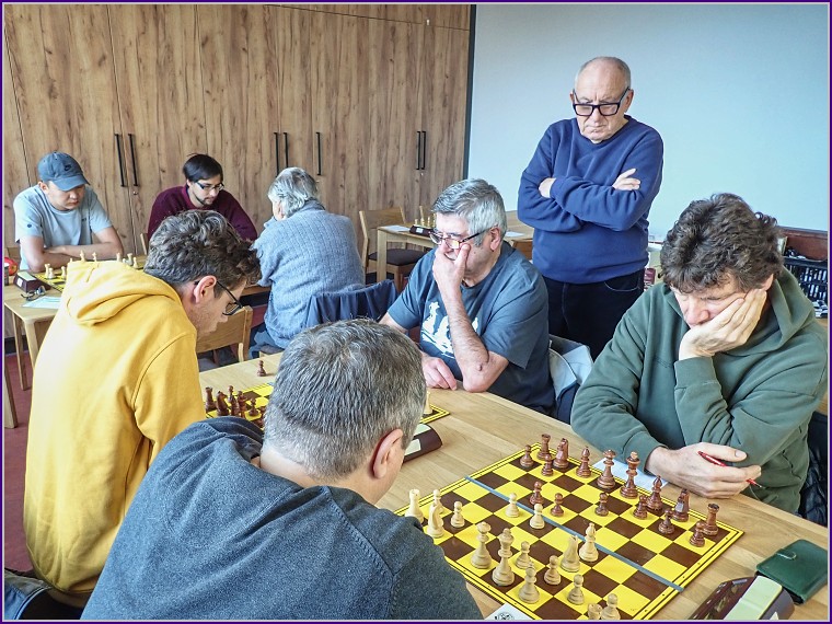 Dohodli jsme se s domácími, že se ujmu role rozhodčího, všechno bylo bezproblémové až na jméno mého soupeře, které jsem při představování hráčů doopravdy nedokázal správně vyslovit. No a pak se hrálo, až malou výjimku na druhém stole (ze strany černého) nebylo slyšet žádné remízové nabídky. A tak tedy jdeme do vedení "zásluhou" Franty, který získal bodík bez boje. 1:0. Jako druhý jsem bodoval já, mladý soupeř se do mě pustil zostra, hlavně na královském křídle se zdálo, že by můj král s oslabeným pěšcovým krytem mohl podlehnout útoku, jenže bílý neměl dostatek trpělivosti ke stupňování převahy a svůj útok v podstatě zakončil ztrátou věže. Sice jsem pak ještě nějakou dobu musel dávat pozor na různé odskoky záludného jezdce, ale podařilo se mi neudělat chybu a po několika výměnách mi ta celá věž zbyla už do jasné koncovky. Soupeř se snažil o protihru do poslední chvíle, ale nástup dvou volných pěšáků skončil matem. Z mé strany, naštěstí. Na malou chvílku zvyšujeme náskok, 2:0. Není to nadlouho. S Pavlem jsme seděli vedle sebe, tradiční vídeňská samozřejmě, ale soupeř se bránil dobře a bylo to spíš vyrovnané. Pavel je pověstný tím, že při hledání útočných možností pěšáky nepočítá, když to vyjde, je z toho obvykle pěkná partie, v opačném případě to končí beznadějnou koncovkou. Dnes k ni ani nedošlo, pozice i bez dvou pěšáků byla hratelná, ovšem přišlo přehlédnutí jednoduché kombinace a před ztrátou minimálně kvality už Pavel kapituloval. Miniaturka, domácí snižují na 2:1.